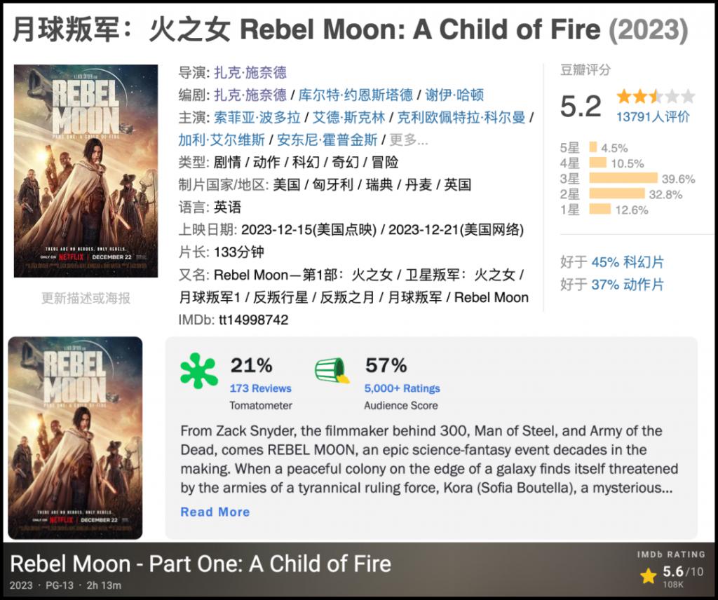 豆瓣 5.2,烂番茄新鲜度 21%、爆米花指数 58%,IMDb5.6,口碑烂到令人发指,四海震荡。
