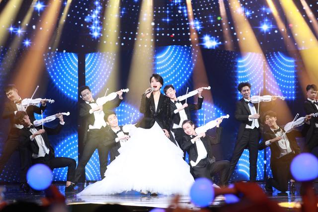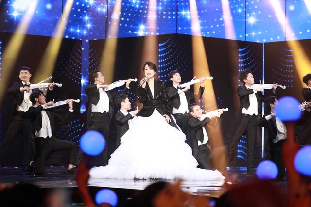 毛阿敏登场时,一袭白色的席地长裙,搭配黑色的小西装,曼妙身姿婉转歌啼。神态自若,眉梢间端庄得体,皮肤也细腻光滑,骨肉匀称。