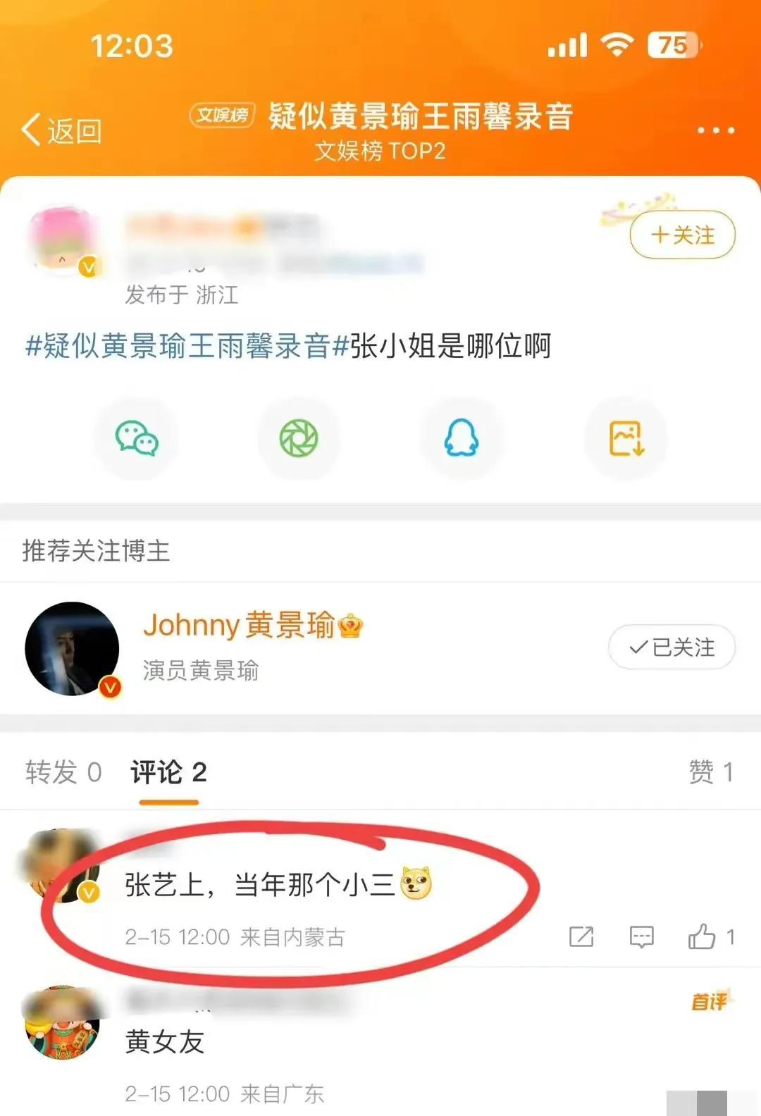 网友扒出来此位张小姐疑似是女艺人张艺上,就是和黄景瑜传绯闻的那个小三。
