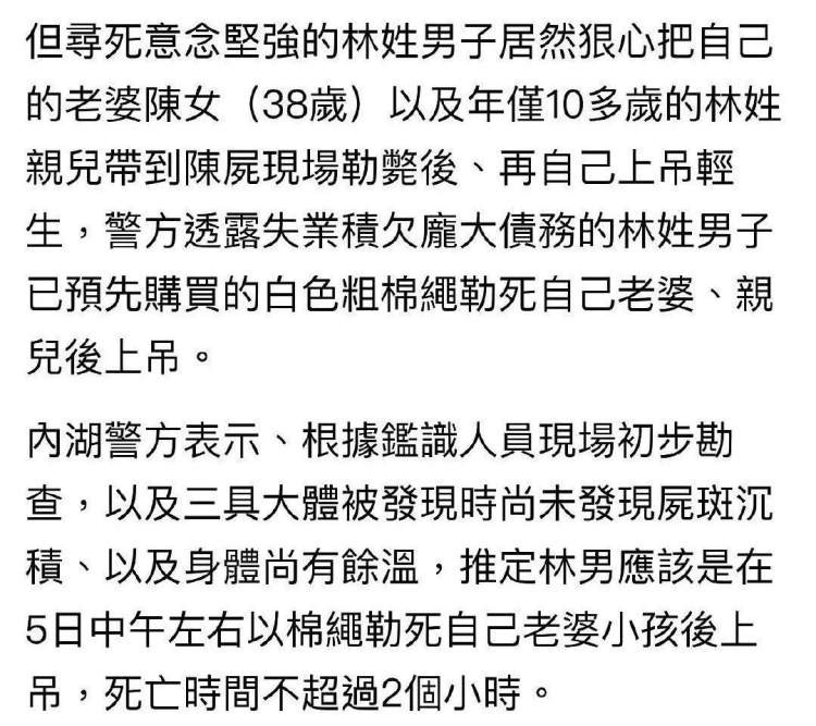 据媒体报道,台北市内湖区1月5日下午发生三尸命案。经过警方调查,确认死者是艺人明道的亲哥哥,疑因欠债无力偿还,勒死妻儿之后自缢。