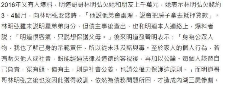 当时明道出席电视剧记者会,叹气称哥哥就像“长期以来的不定时炸弹”,认为这次对方应该为自己的人生负责,自己出面处理。