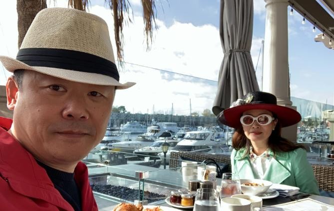 和他一起出行的还有他的富豪妻子。