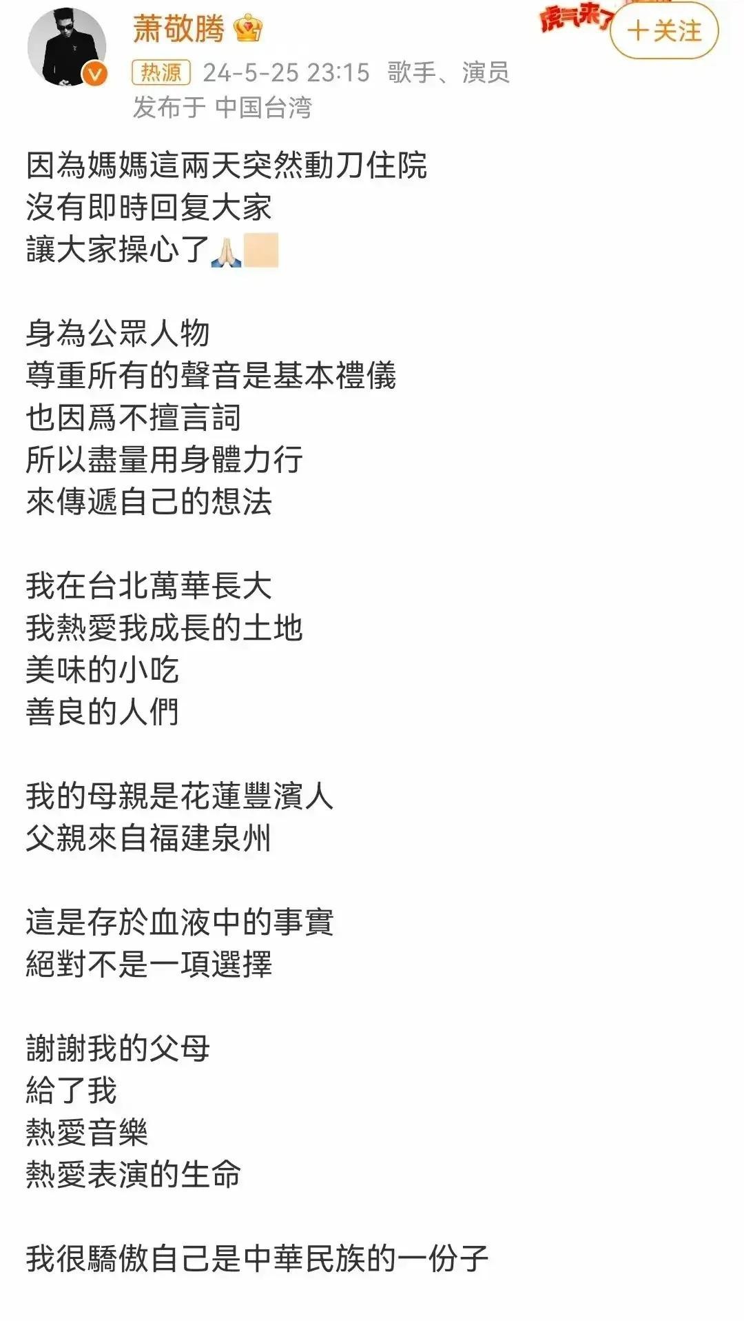 歌手萧敬腾发声:“我,萧敬腾,生于台北万华”表示已站明立场!
