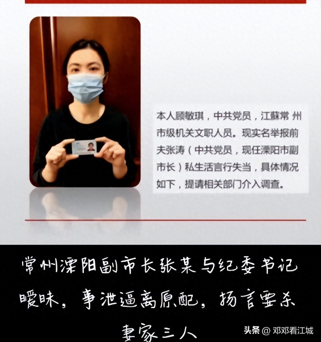 ①顾敏琪女士实名举报她的老公溧阳市某干部张涛,说张涛和曾经的女同事大搞暧昧关系。