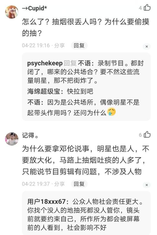 可以看得出,在这些粉丝眼中,他们觉得这一切都是节目组的错,不应该播放出来,甚至认为别人不应该揪着邓伦抽烟不放,不应该上纲上线,这样的三观是不是存在问题呢?