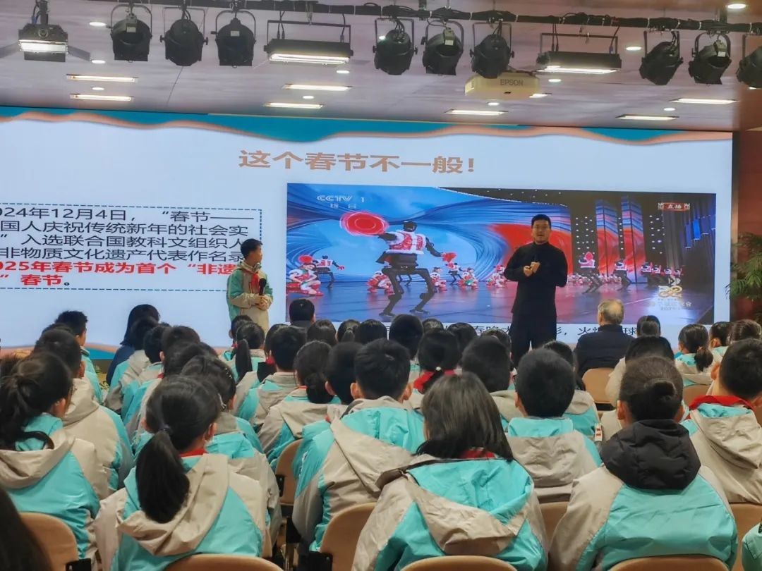 一段“我的非遗春节VLOG集锦:非遗年味的数字记忆”拉开娄山中学开学典礼的序幕。六(7)中队的杨元泽和爸爸杨文雅走上台,分享《一个现代家庭的传统文化修炼》,向大家讲述了关于非遗文化传承的家庭经验。在这个家庭中,妈妈从事传统文化工作,爸爸专注“数智驱动”,从小耳濡目染的杨元泽因此有了对传统文化与现代科技的多彩实践和深刻思考。