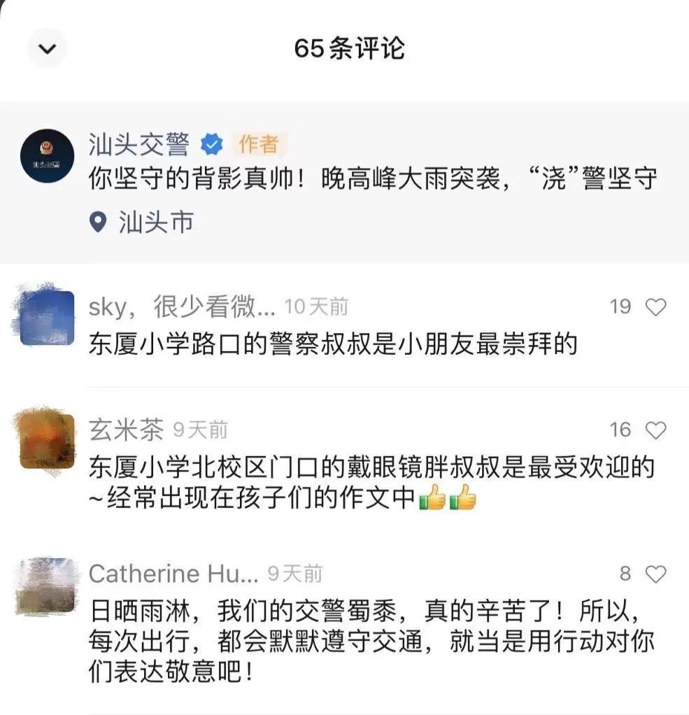 在东厦小学北校区门口,交警金平大队二中队辅警罗金松和金平大队一中队辅警郑华生冒着大雨维持交通秩序,疏堵排畅,保障学生安全放学离校。这一幕被热心群众拍成视频放上网络平台,全网浏览量近20万。一时间罗金松成了“网红”,引发广大网友纷纷点赞,不少该校学生的家长认出了他,并亲切地称呼他为“胖叔叔”。