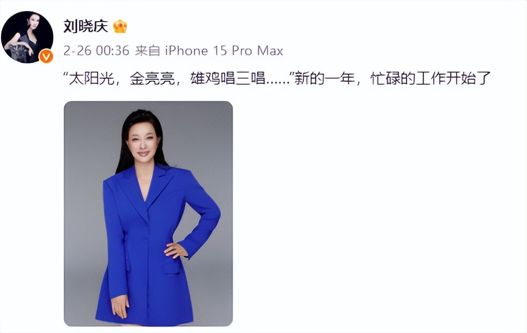 而和她并称三朵金花的刘晓庆2月26日在社交媒体发文称:“太阳光,金亮亮,雄鸡唱三唱……新的一年,忙碌的工作开始了”并且还配了她的美照。