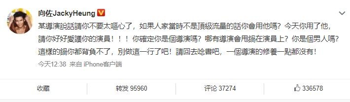 随着舆论的增大,香港影圈大佬向华强之子向佐发文,疑似将矛头直接对准了滕华涛,怒怼其太恶心了并反问到:“如果鹿晗当时不是顶级流量的话你会用他吗?今天你用了他,请你好好爱护你的演员!你确定你是个导演吗?你是个男人吗?”,评价滕华涛作为导演“修养一点都没有!”。可见向佐十分生气。向佐怒怼滕华涛也迅速引来了40多万人点赞。