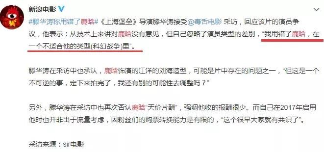 《上海堡垒》遭遇票房口碑双失败,滕华涛称用错了鹿晗,遭向佐怒怼