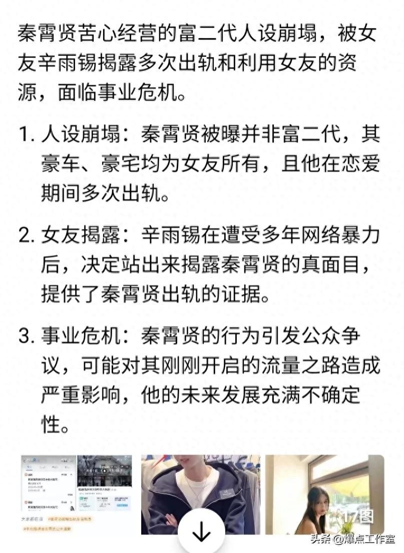 大家好,我是爱凑热闹的爆点,这几天娱乐圈最大的事无非就是秦霄贤出轨,富二代人设塌房,网上炒得沸沸扬扬,爆点今天就跟大家说说我知道得内幕吧。