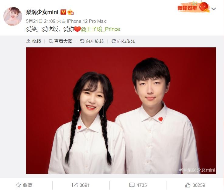 5月.21日大胃王mini突然公布婚讯,得知消息后不少粉丝都震惊了。此前大胃王mini在社交平台上发布的大多都是她的吃播视频以及日常分享,不曾透露出有关私人感情的任何消息,这突如其来的官宣令粉丝们感到一头雾水,粉丝都在质疑消息的真假。