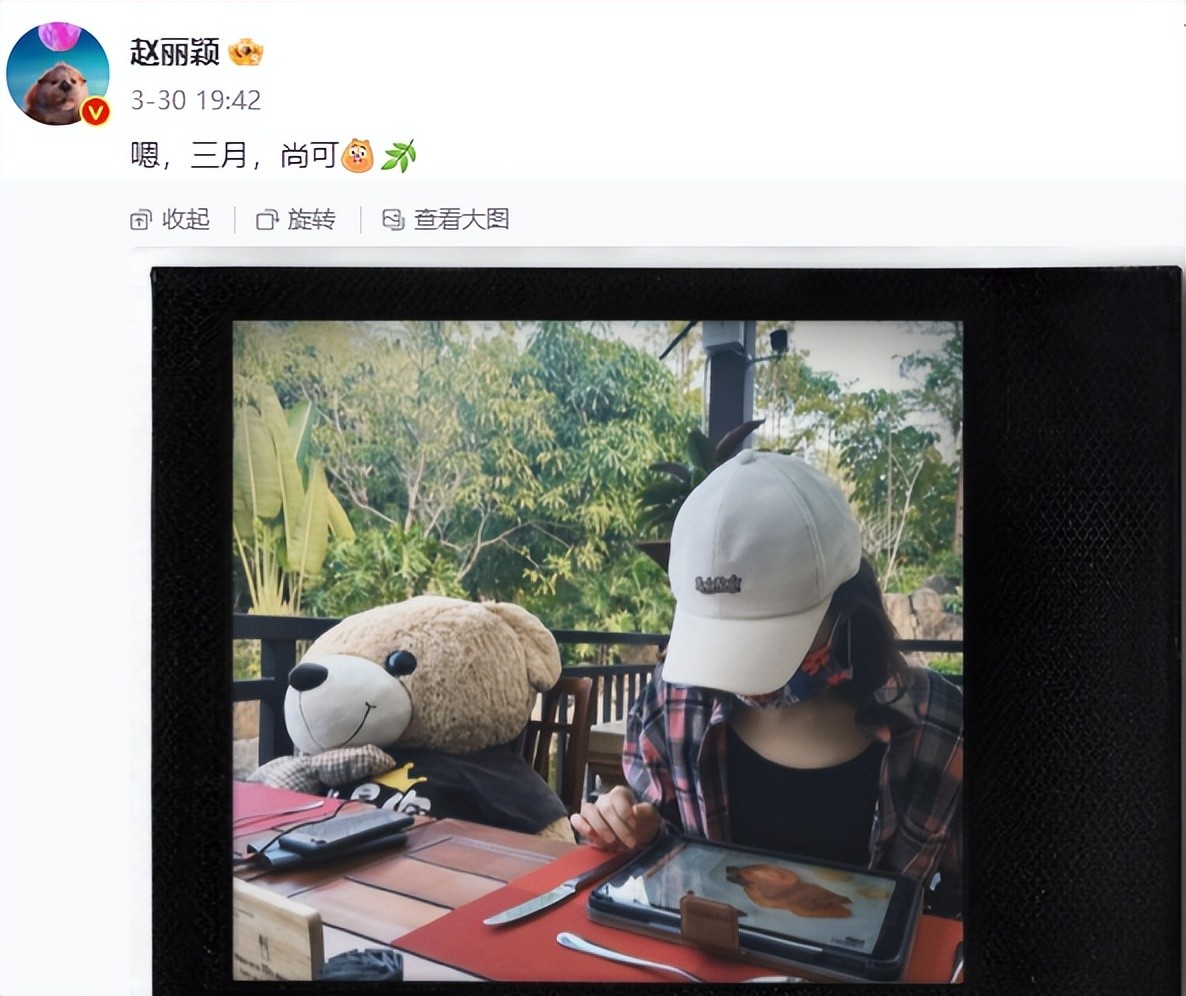 赵丽颖自己也在三月底发出过自己在云南山林间休息的照片,似乎为了减肥,原本应该放食物的餐桌上只摆放了一块平板,周边还煞有其事的摆放了刀叉。