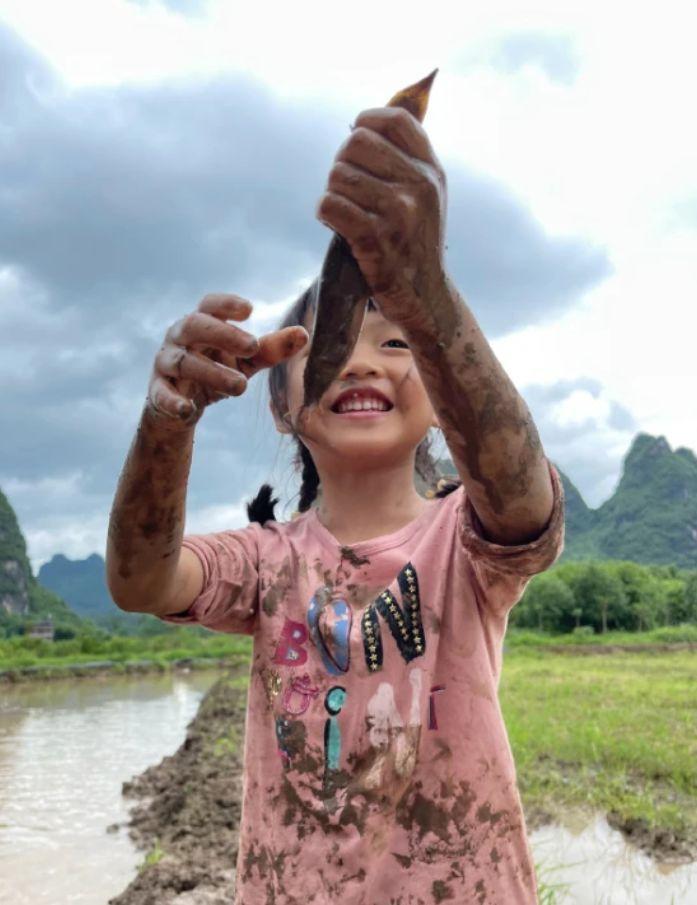 女儿茉莉花全身也沾满了黄泥,嘴里甚至满是泥巴。茉莉花也直接用手抓着一只泥鳅,满脸笑容,像妈妈姚晨一样咧嘴笑。