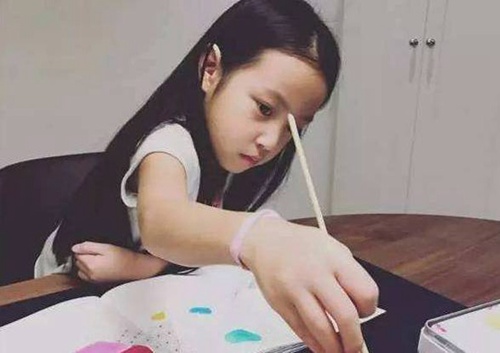 最近赵薇在个人社交网站晒出了一张小四月正在认真写字的照片。