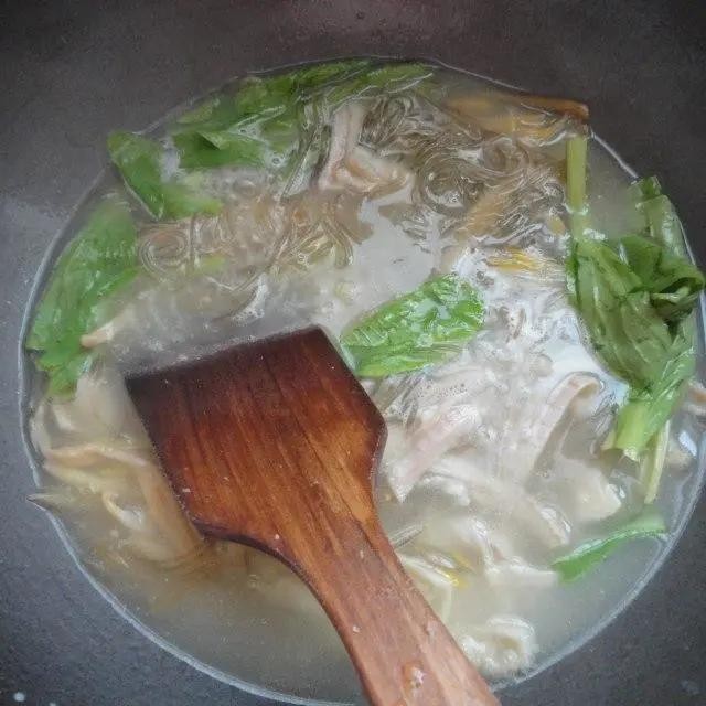第7步、加入提前用冷水泡软的红红薯粉丝和青菜,放适量的食盐
