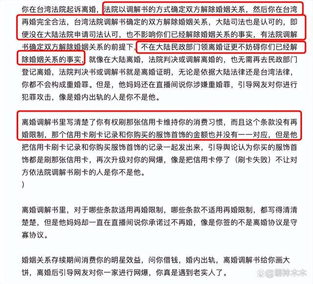 至于离婚协议书,大 S 在台湾省起诉离婚,法院用调解书的方式确定双方已经解除了婚姻关系,再婚完全合法,同样在大陆也是认可的。所以张兰口中大 S 犯了重婚罪也是不成立的。还有信用卡,离婚协议中明确写了大 S 有权刷卡,而且这一条没有再婚限制。汪小菲之前晒出大 S 刷信用卡买奢侈品,但刷卡记录与首饰金额对不上。