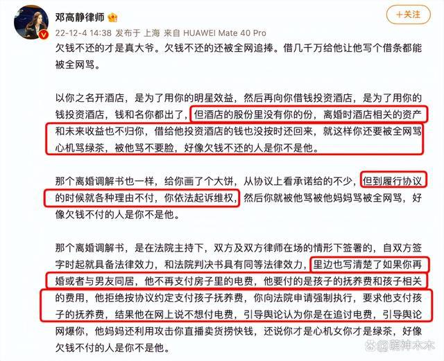 大 S 回归微博发声了。经历了长时间的拉锯战之后,大 S 首次在微博上回应了此次离婚协议风波,一位名叫邓高静的律师从法律层面去解释双方的离婚协议以及大 S 之前晒出的欠条,随后大 S 评论力挺律师。