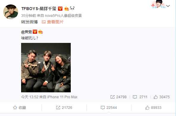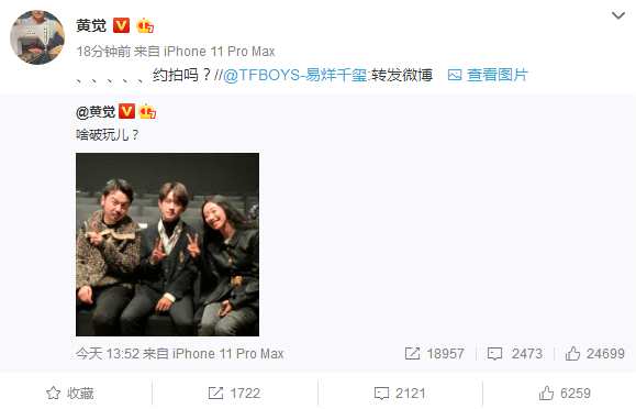 不曾想易烊千玺看到了黄觉所发的内容,亲自用昨晚自己参加活动的单人照片P了一张与黄觉的合影,转发到自己的个人社交帐号下边。引来网友们哈哈大笑,而黄觉本人似乎看到了希望,立刻转发邀请易烊千玺:“、、、、约拍吗?”