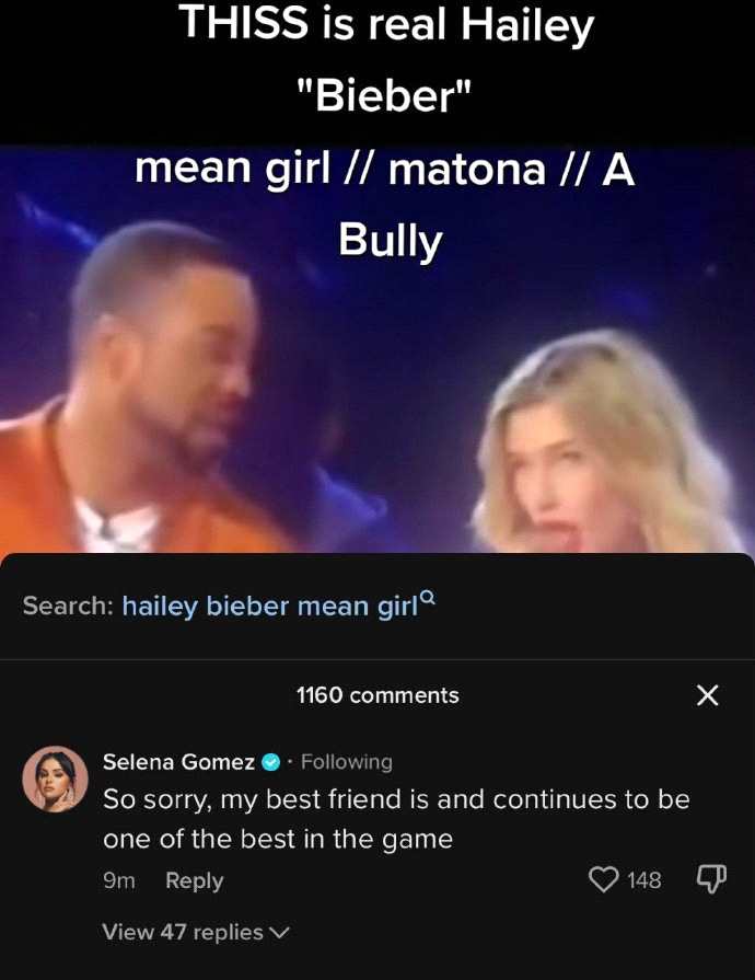近日,赛琳娜·戈麦斯在一则海莉·比伯曾经侮辱好姐妹“霉霉”泰勒·斯威夫特的视频下评论:“很抱歉,我最好的朋友现在是并将继续是这场游戏(娱乐圈)中最强的玩家之一。”