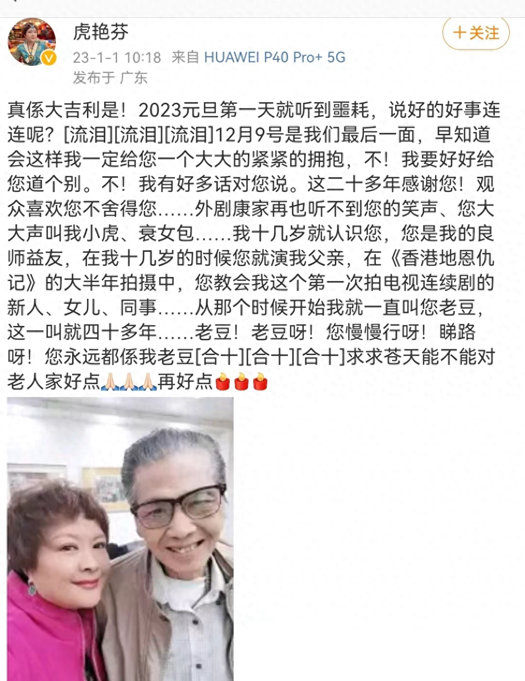 同剧组的“康家二嫂”的扮演者虎艳芬在元旦早上发了微博长文,沉痛的悼念戏中“老豆”康伯,看着微博的内容,真是闻着伤心落泪。