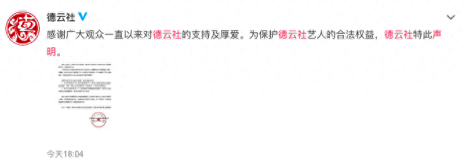 刚刚,德云社在微博晒出了一张声明书,“感谢广大观众一直以来对德云社的支持及厚爱。为保护德云社艺人的合法权益,德云社特此声明。 ”