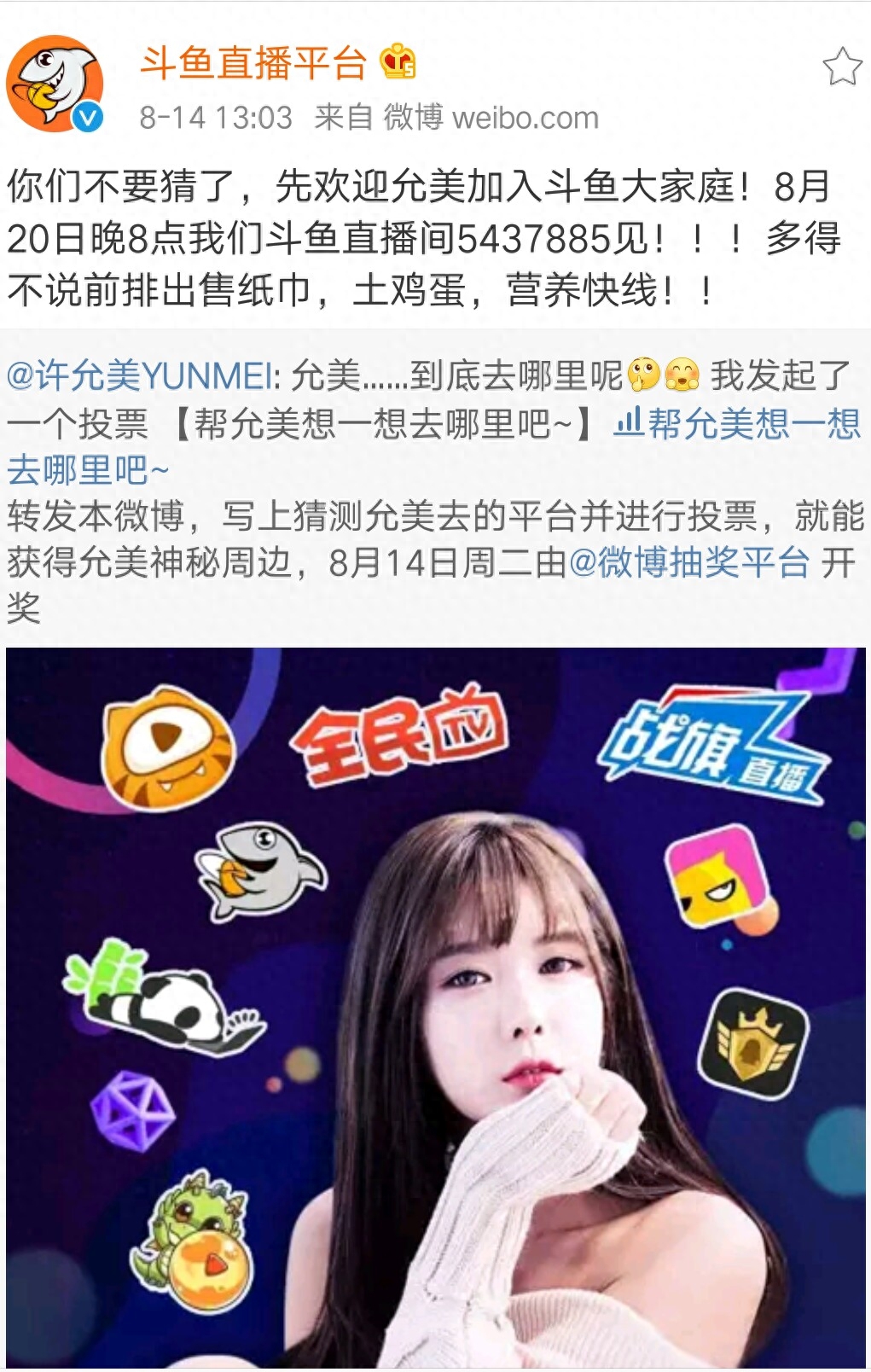 韩国女主播许允美入驻斗鱼,网友喊话旭旭宝宝:宝哥,允美来了!