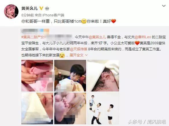2017年11月27日下午,黄英在微博宣布二胎女儿的诞生,并透露女儿出生体重和儿子一样,与此同时还曝光了小公主的小脚丫以及小肉脸。现在黄英已经是两个孩子的母亲了。