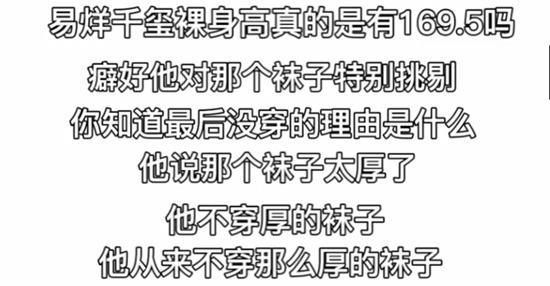 视频中有女生问道易烊千玺的裸身高,该爆料男或许是想在异性面前表现便极限的拉踩易烊千玺。该男子表示易烊千玺的身高绝对有169.5cm,还爆其有不穿厚袜子的洁癖。