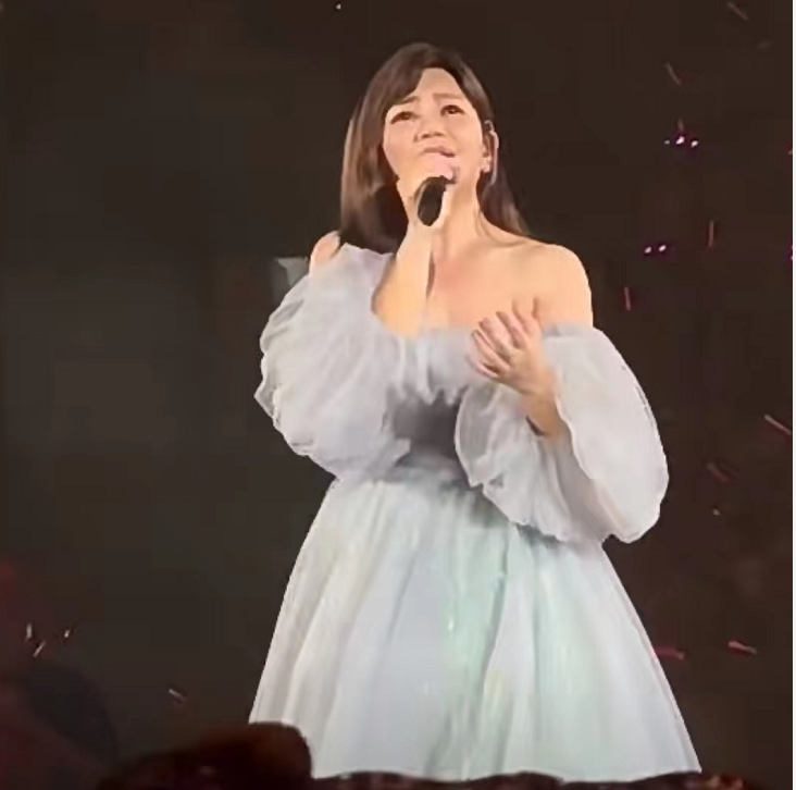 曝光的画面中,梁静茹正身处台上献唱成名曲《分手快乐》。只见她穿着露肩灰色纱裙,发型和妆容都很精致,打扮高贵典雅。