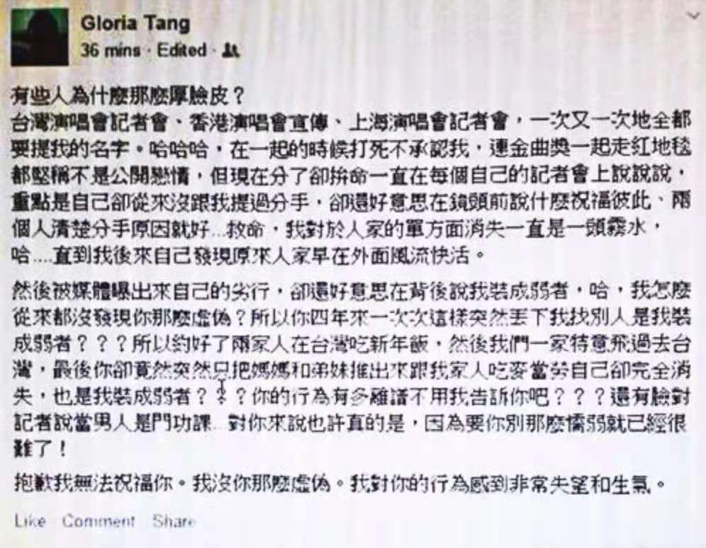 脾气火爆的邓紫棋哪里能受得了这气,直接在社交媒体上大骂林宥嘉是渣男,并控诉林宥嘉的五宗罪:虚伪、懦弱、脸皮厚等等,而且说林宥嘉在他和邓紫棋在一起时打死都不承认这段感情,分手后却把这段恋情拿出来反复说。