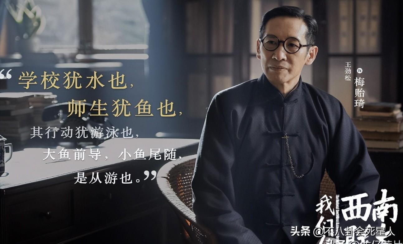 王劲松在剧中饰演的是清华大学校长梅贻琦,你还真别说,王劲松演反派是一绝,但穿上长衫、戴上眼镜,又活脱脱是一位文人了。