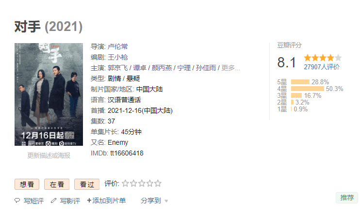 半个月的陪伴,说长不长,说短不短,不过有一点可以肯定的是,《对手》已经是2021年最好的谍战剧了。