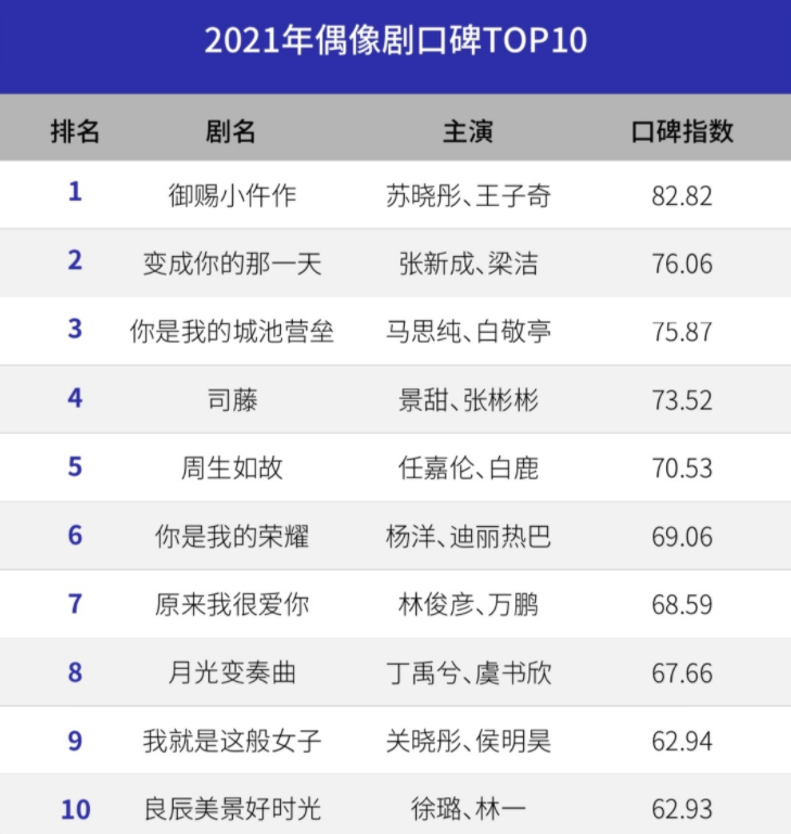 看排名靠前的几部剧,靠的都是强大的内容和演技,“流量明星”的时代已经一去不返了,用心选内容、打磨剧本才是王道!这10部排名前十的偶像剧,大家都看了几部呢?