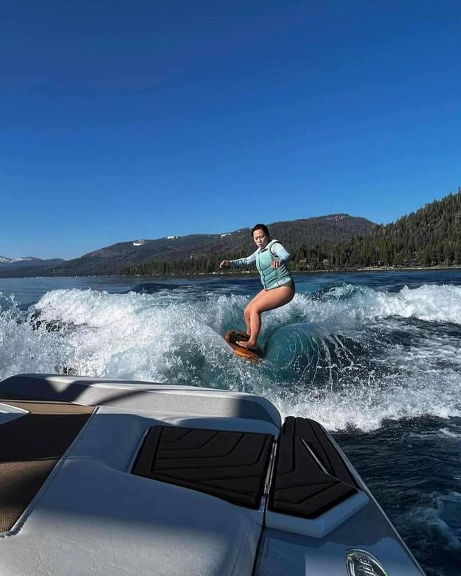 普莉希拉 · 陈还分享了自己掌握的新技能,利用电动冲浪板冲浪。不知道这是她丈夫怂恿的呢,还是她原本就想要尝试。