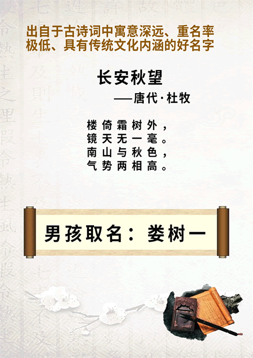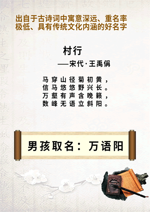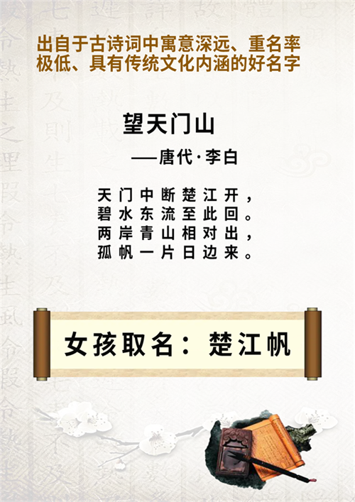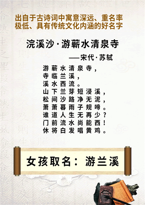 现如今,随着我国经济的发展、国家的日益强大,中国几千年的传统文化越来越得到更多人的重视和传承。家长在给新生宝宝起名时更注重名字要有内涵、庄重、文雅,名字要有相应的出处。今天笔者整理几个出自于古诗词,重名率极低的美名供读者参考: