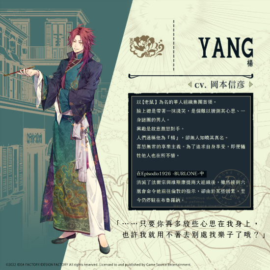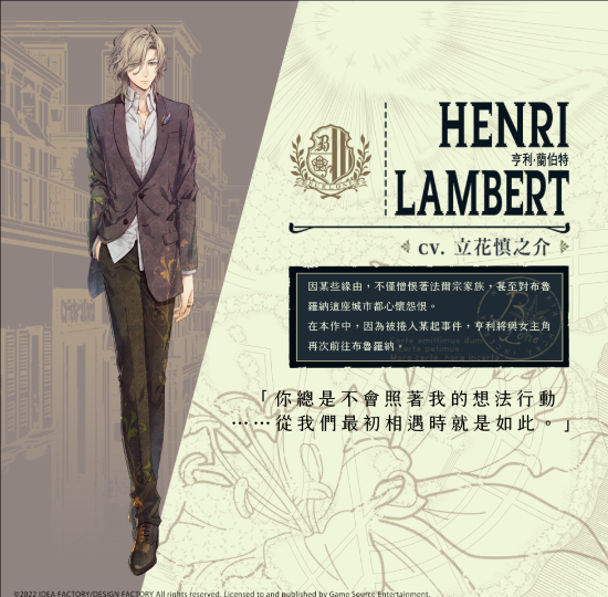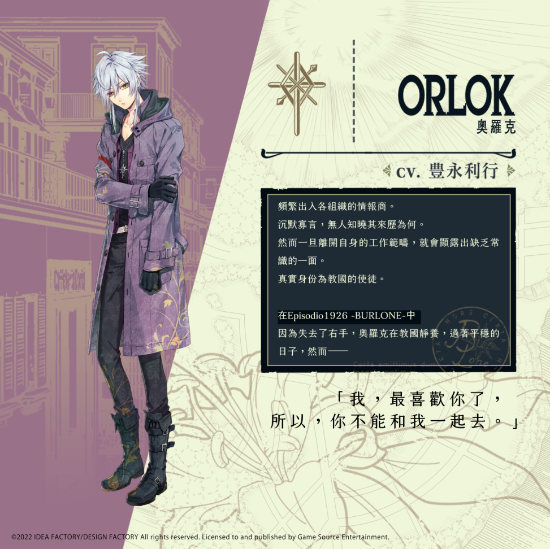 由Game Source Entertainment (GSE)与著名日本游戏公司“Idea Factory”旗下的乙女游戏品牌“Otomate”合作发行的人气乙女游戏续作《虔诚之花的晚钟-1926-》繁体中文版,即将于2022年内在Nintendo Switch上与各位玩家见面。今天将率先为大家介绍游戏中7个主要角色,在重温各角色背景的同时,也会为大家公开他们在新作中的最新情报。