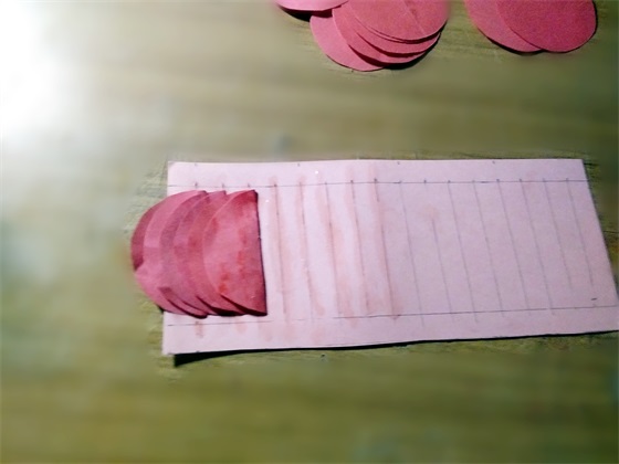 剪一张硬卡纸,宽度比圆的直径长两厘米。在上下一厘米的地方画线,每隔一厘米画一条线,把纸分成十几个格子。把剪好的圆形对折,贴在画好的线上。