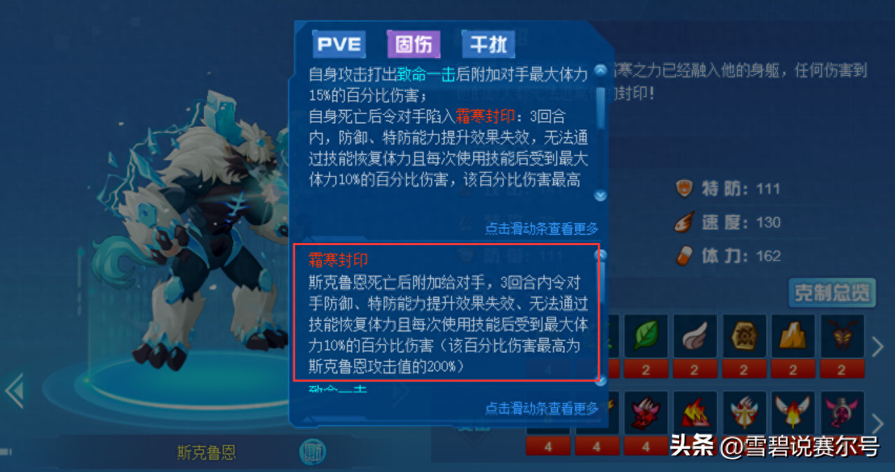魂印效果【斯】自身攻击打出致命一击后附加对手最大体力15%的百分比伤害;自身死亡后令对手陷入霜寒封印:3回合内,防御、特防能力提升效果失效,无法通过技能恢复体力且每次使用技能后受到最大体力10%的百分比伤害,该百分比伤害最高为斯克鲁恩攻击值的200%。