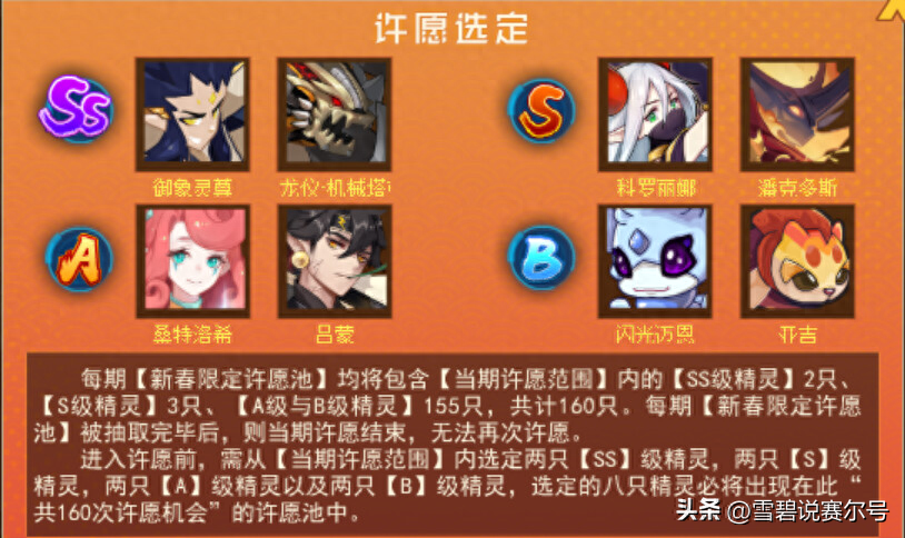 精灵定位S级,目前活动已经结束,错过的玩家只能等今年六月份的周年庆许愿池我们再见。回归概率大,所以玩家可以放心完全绝版。