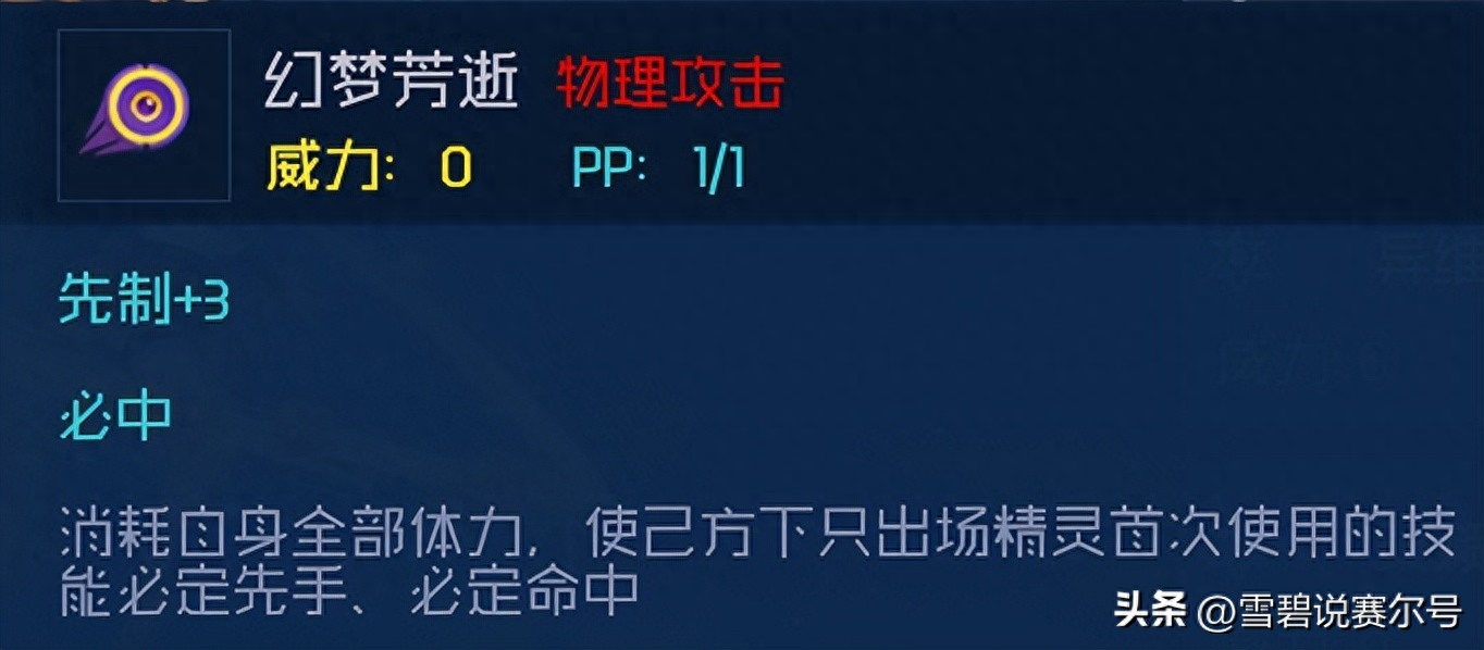 幻梦芳逝:先制+3;必中;消耗自身全部体力,使己方下只出场精灵首次使用的技能必定先手、必定命中。伪8引爆,1回合引爆也是引爆,可以搭配弹伤来使用。真的蒂朵+六界是做到了,“贫民”玩家也可以打PVE!