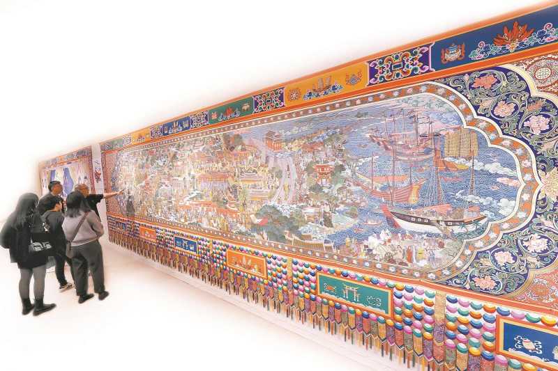《泉州海丝唐卡百米长卷》包含“东方大港”“世界商埠”“多元文化”“丝路远航”“美美与共”等10个主题,由14幅画组成。三年多来,创作团队已完成了《前言》《开篇》《东方大港》《世界商埠》四幅画作,每一幅都是倾注心血、精心打磨的佳作。