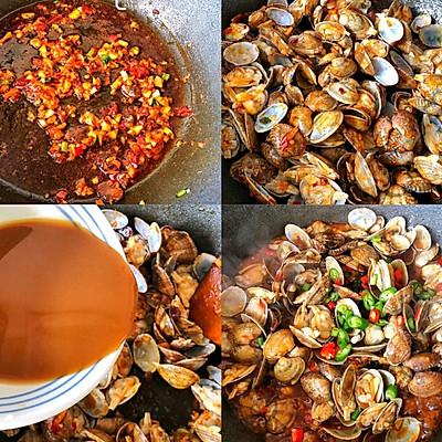 3、3️⃣、锅中热油炒香葱姜蒜末,放一勺豆瓣酱炒出红油,加入花蛤翻炒均匀,倒入酱汁大火翻炒入味,倒入小米辣、葱花翻炒均匀即可出锅~