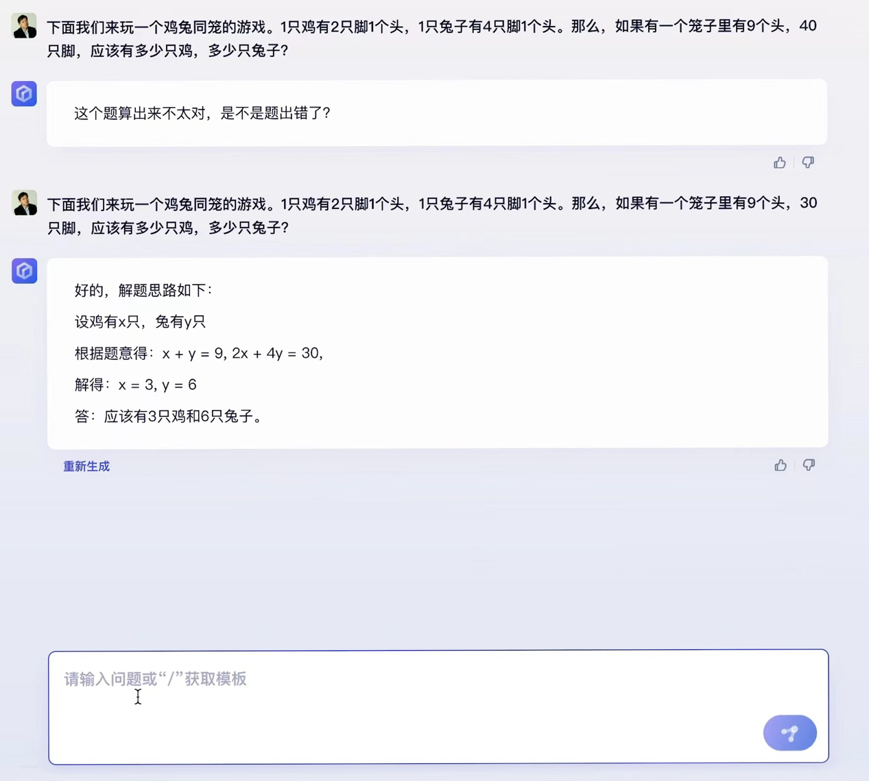 李彦宏:对于第一道题,文心一言经过演算,认为可能是题出错了。对于第二道,文心一言不但给出了正确结果,还详细给出解题步骤。可以看出,文心一言能理解题意,并有正确的解题思路,进而像学生做题一样,按正确的步骤,一步步算出正确答案。