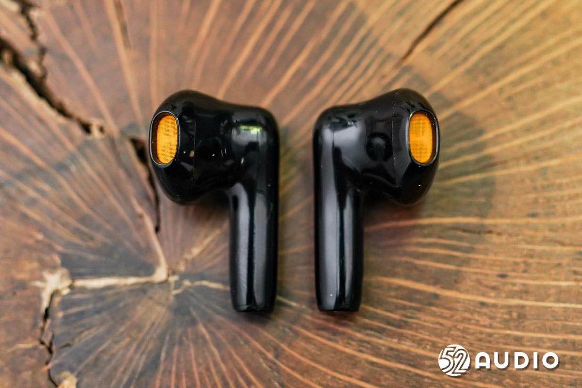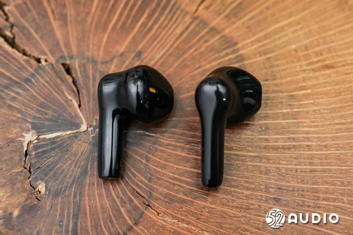 耳机内外侧对比一览,短柄半入耳式设计;表面采用与充电盒相反的亮面质感,依旧为黑黄撞色。