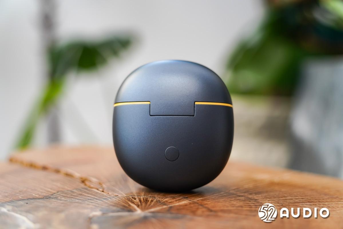 充电盒形如鹅卵石,表面为细腻哑光磨砂质感,不易沾染指纹,更耐刮蹭;整体为黑黄撞色设计,开盖处设有一条从正面贯穿至背面的明黄色星环腰线,下方是状态指示灯,中间是iQOO品牌Logo。