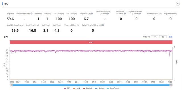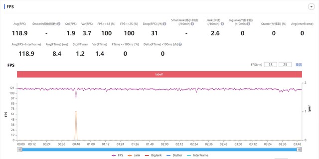 从结果中我们可以看到,即使在高画质、高帧率条件下运行《王者荣耀》、《和平精英》这两款游戏时,OPPO Reno8 Pro+的游戏帧率曲线依然十分平缓。其中OPPO Reno8 Pro+在运行《王者荣耀》时平均帧率为118.9帧;运行《和平精英》时平均帧率为59.6帧。整个游戏运行过程无卡顿、掉帧等情况出现。