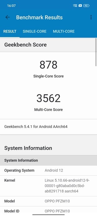 可以看出,搭载天玑8100-MAX处理器的OPPO Reno8 Pro+安兔兔跑分成绩为810279分;Geekbench 5单核成绩878分,多核成绩3562分。整体表现达到了同价位应有的水准,能够很好地满足日常使用乃至于大型手游运行等需求。