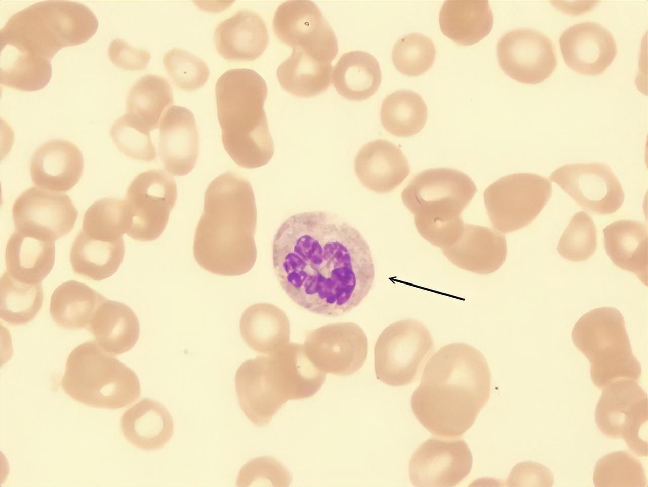 由于细胞体巨大,与细胞核发育不同步,导致细胞核染色质疏松,从而形成巨大的血细胞。由于这种巨幼红细胞在脊髓中容易被破坏,导致无效红细胞的产生,最终导致红细胞数量不足和贫血。