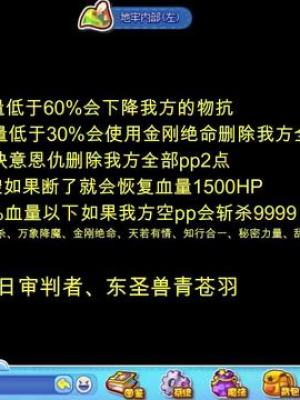 我们使用“东圣兽苍羽”,“圣尊武王”在60%血量以前随便打,打这个BOSS我们的防控千万不要断,断了“圣尊武王”就会回血,在“圣尊武王”的血量低于60%的时候,会给我们下降物抗,等负面物抗低于3级左右,我们就使用【御风游龙】清除一下。当“圣尊武王”血量低于30%的时候会删除我们的技能值,我们千万不能空pp,空PP那么就凉了,这个时候我们要做的就是慢慢的保证自己防控没有断,自身的负面等级不高,没有空PP,慢慢的使用【云起龙骧】输出,慢慢打就行,慢慢消耗这样就过关了。